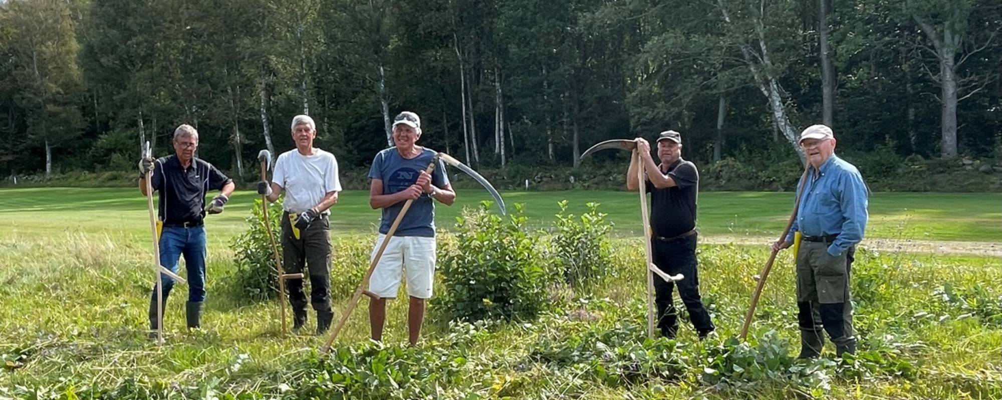 Fördelen med att använda lie är att man får långa strån som är lätta att räfsa upp. Det är dessutom väldigt roligt. Blomsterängar skall alltid räfsas ett par veckor efter slåtter för att på sikt magra ut marken så att det blir fler blommor och mindre gräs. Ängarna vid kiosken och vid tians tee slogs av klubbens liegrupp.